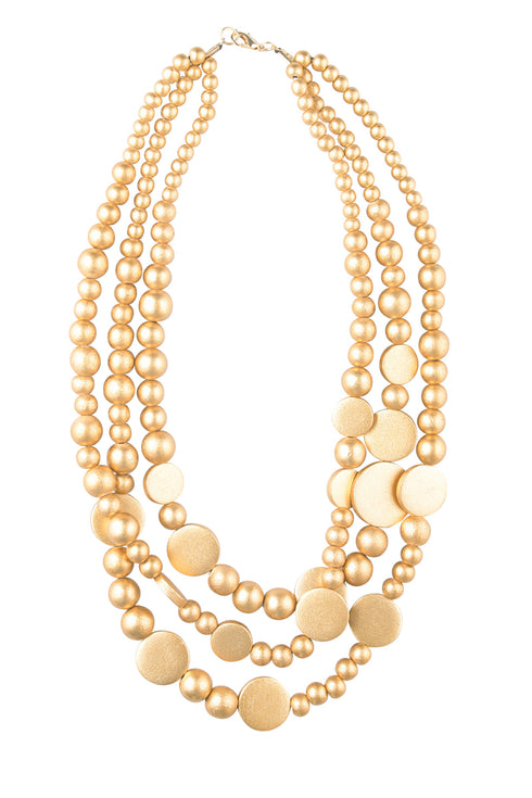 Kanani è una collana che rinfresca immediatamente il vostro abbigliamento. È composta da tre catene individuali di dimensioni diverse, unite tra loro. Ognuna è composta da perline e dischi di legno.