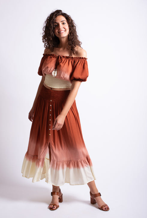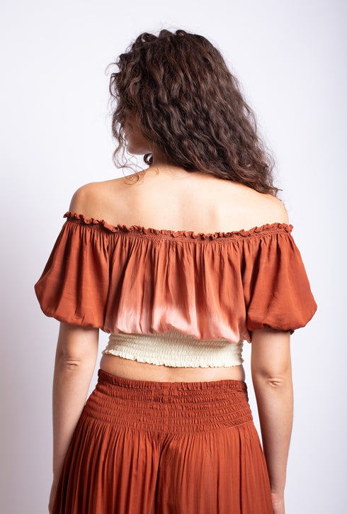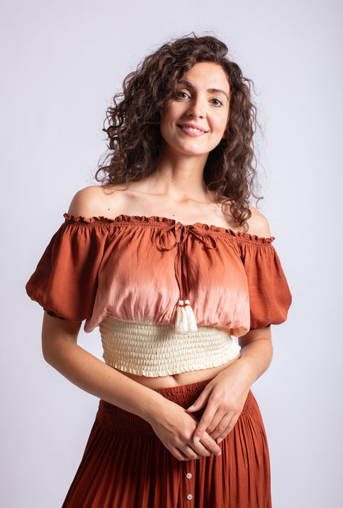 Il nostro top estivo "Gemma" in stile boho è perfetto per chi ama un look giocoso. Grazie all'elastico in vita, è comodo da indossare e la scollatura regolabile assicura una vestibilità perfetta. Indossatelo off-shoulder o come camicetta corta e create il vostro look unico.