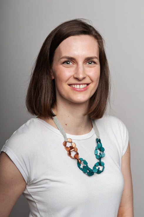 I numerosi elementi in legno conferiscono alla collana Malea un motivo elegante. La collana è composta da tre file di legno naturale. Le tonalità eleganti contrastano con un colore metallico.