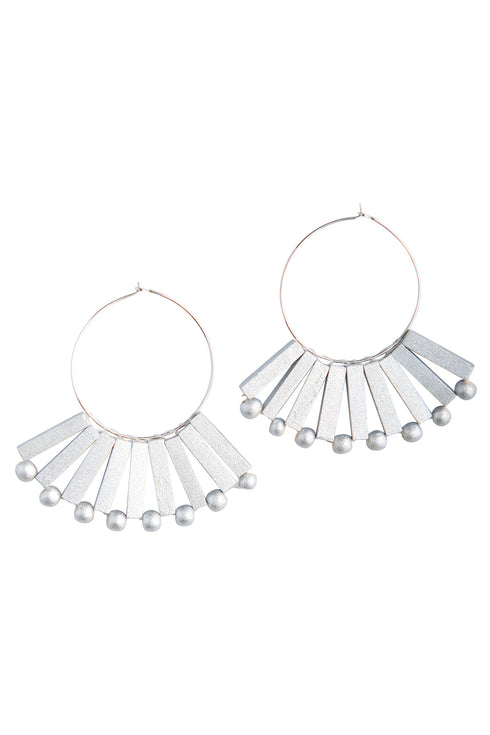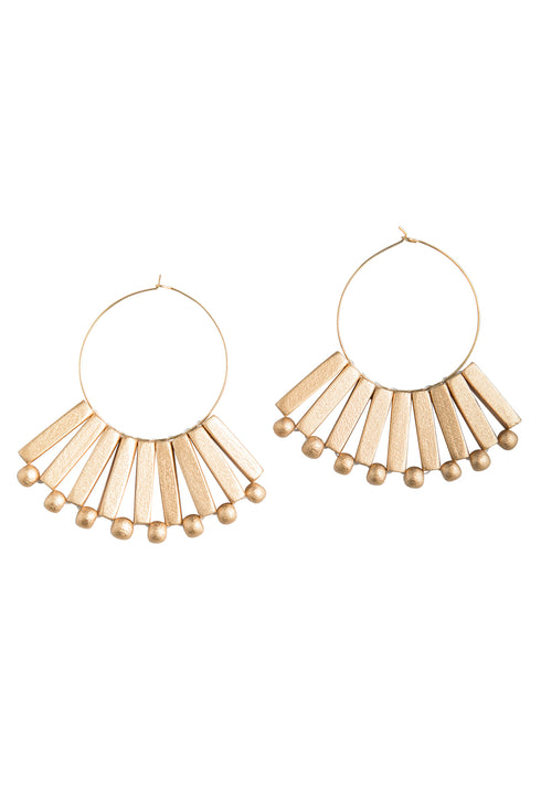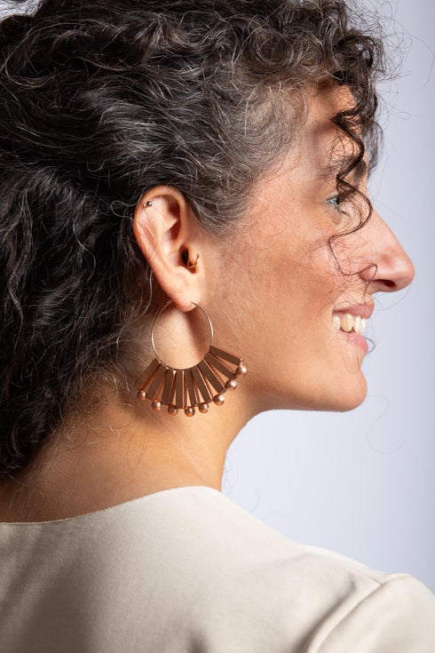 Gli orecchini a cerchio Edineia sono composti da elementi in legno disposti a ventaglio. Questi sono allineati su cerchi e colpiscono per i loro colori metallici.