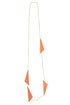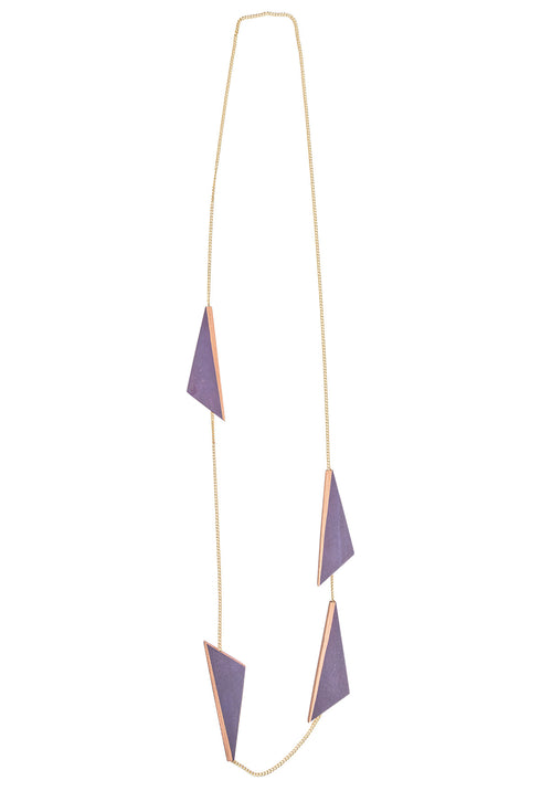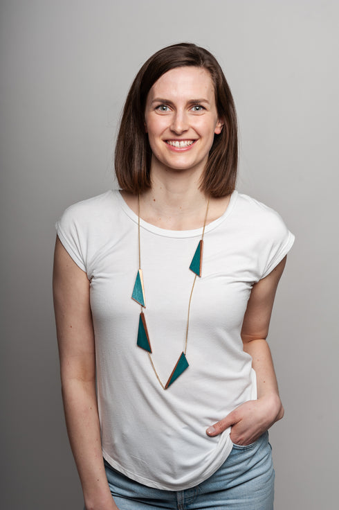 Triangoli di legno infilati in un filo di ottone formano la collana Modern Marley. È disponibile in due diverse combinazioni di colori.
