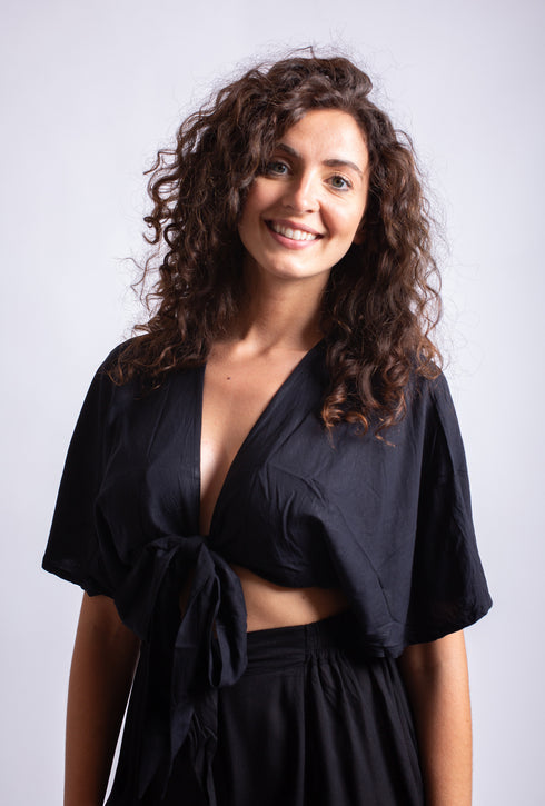 L'ampio top in viscosa in un look batik di tendenza può essere abbinato in vari modi e può essere legato a piacere. Disponibile in look batik e in nero, è un elegante eye-catcher per l'estate.