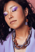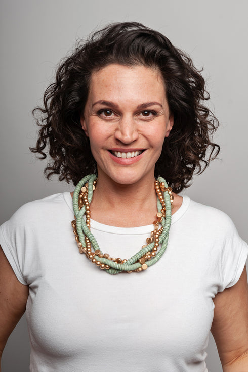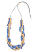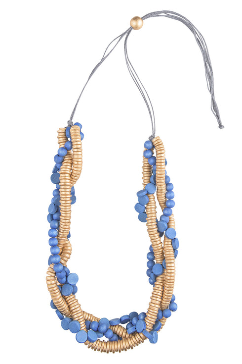 La collana Lolani è composta da quattro file attorcigliate con diversi elementi in legno. I colori semplici fanno risaltare l'oro metallizzato.